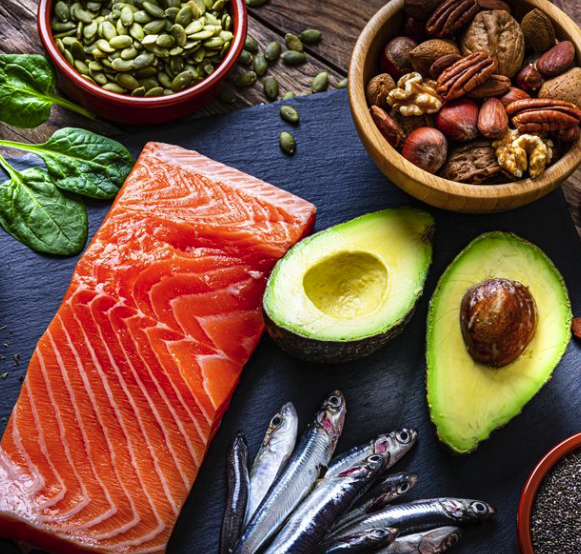 고등어, 삼치, 연어 등 등푸른 생선에 풍부한 오메가-3 지방산은 중성지방 감소와 혈전 예방에 도움이 됩니다.